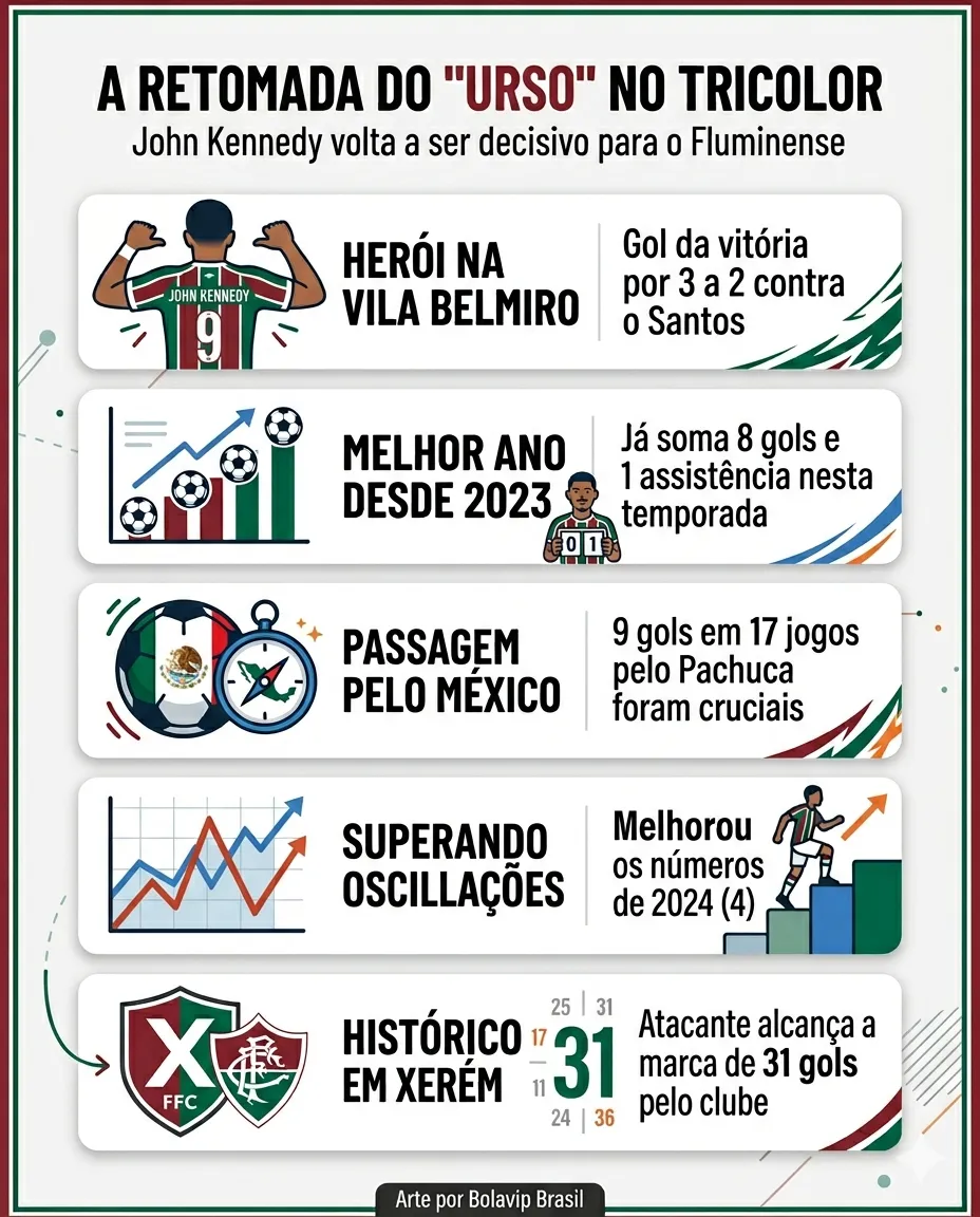 O Fluminense vive bom momento na temporada e um dos principais nomes da equipe é John Kennedy, que atravessa sua fase mais artilheira desde 2023, sendo peça importante no setor ofensivo e ganhando cada vez mais confiança. O atacante foi decisivo na vitória por 3 a 2 sobre o Santos, na Vila Belmiro, onde marcou o gol da vitória.