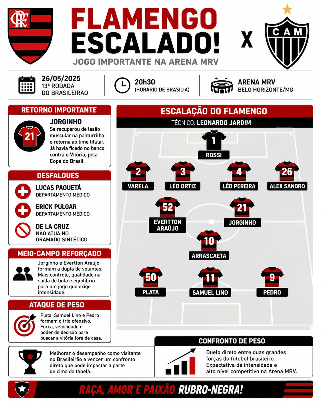 O Flamengo está escalado para enfrentar o Atlético Mineiro e terá o retorno de Jorginho entre os titulares. A volta do volante reforça o meio-campo em um jogo importante fora de casa.
