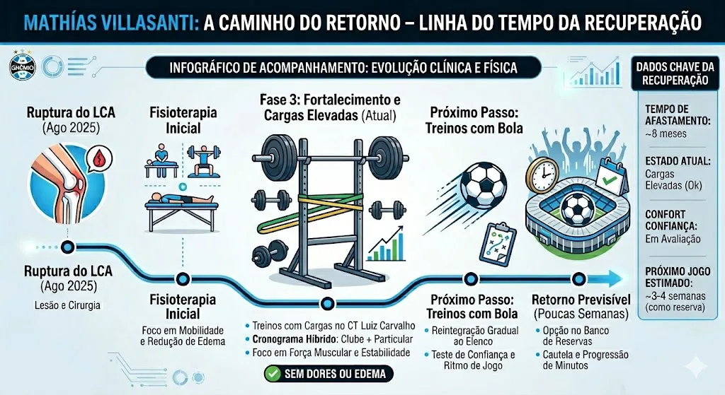 O próximo passo de Mathías Villasanti é aquele que separa recuperação de retorno: a reintegração gradual aos treinos com bola, ao lado do elenco. É aí que se mede o que não aparece nos relatórios — tempo de bola, leitura de jogo e, sobretudo, a confiança nas divididas, essência de quem vive da contenção. A comissão técnica do Grêmio trabalha com um cronograma previsível: relacioná-lo em poucas semanas, inicialmente como opção no banco. A cautela faz sentido. No fim, não há atalho.